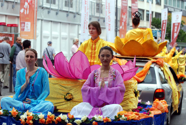 ![]() 精美的花车上,法轮功学员展示功法。 |