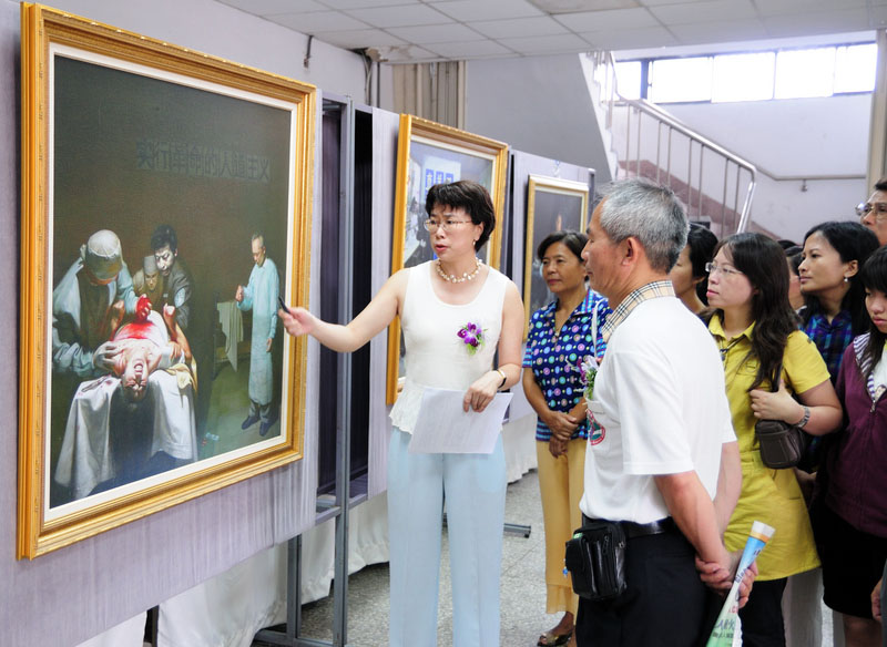 “我看的快要流眼泪了”,听完画作导览后的高基赞议员眼眶微微泛红的说,“我真的快忍不住了,尤其活体摘取器官的那一幅,我们在台湾是想象不到的,还有那些纯真的小孩失去了双亲的,如果是自己的小孩也这样,实在太可怜。”“我想大陆还有很多真相要靠那边的学员传送过来,透过艺术比影像更能展现心灵层面,今天巡回展真是相当好。”