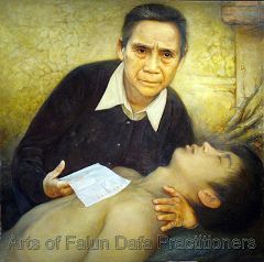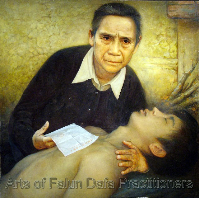 ![]() 油画《保外就医》:画中老人收到保外就医的通知,领回被迫害致生命垂危的儿子,眼神流露着悲愤。 |