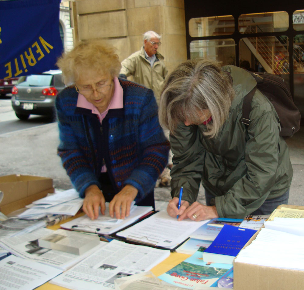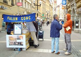 一位中国的留学生,主动走到摊位来了解情况。开始时她说一些中共散布的污蔑法轮功的话。法轮功学员Gisele解释说:“那不是真的,法轮功没有禁止吃药和去医院看病。我们也不是在搞政治。是因为中共在非法迫害法轮功,如果它不迫害,我们也不用出来给大家讲真相,难道这就叫搞政治吗?试想,如果迫害不是发生在中国,而是在瑞士,那么中国的法轮功学员会怎样做呢?”后来,这位学生说:“是,中国政府(中共)是不好,已经很长时间了。”