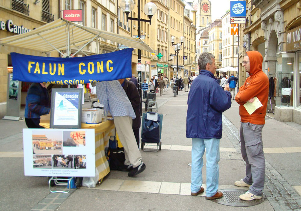 【明慧网二零零八年六月三日】二零零八年五月三十一日,法轮功学员在瑞士纳沙泰尔城(Neuchatel)的市中心医院路(rue de l’hopital),举办了一天的洪扬法轮功的活动。位于瑞士最大的湖泊——纳沙泰尔湖(lac de Neuchatel)北方的纳沙泰尔城(Neuchatel),是纳沙泰尔州的首府。它是一个具有浓郁中世纪色彩的城市。