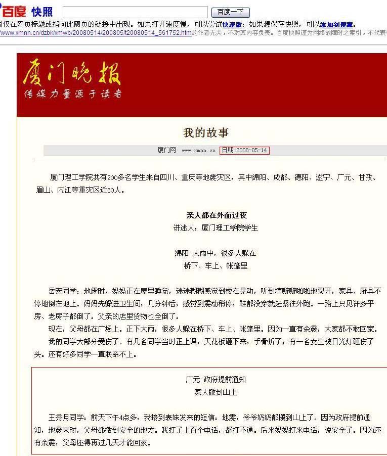 4.《厦门晚报》5月14日披露表明:四川省广元政府预报地震,人员疏散平安
