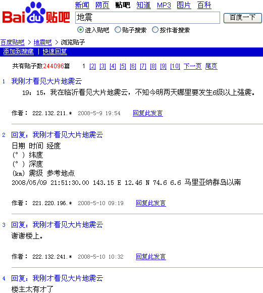 图8: 百度贴吧――地震吧做出的预报