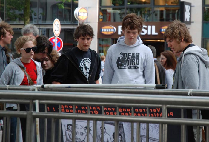 【明慧网二零零八年六月三十日】为了迎接七月一日全球退党日,声援三千九百万人退出中共,揭露中共活摘法轮功学员器官牟取暴利的罪行,德国北部汉堡(Hamburg)大法弟子于六月二十八日,在市中心最大的购物区蒙肯贝克大街Moeckenbergstrasse举行了真相图片展等活动。