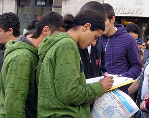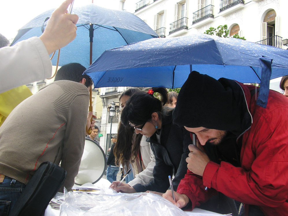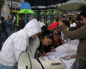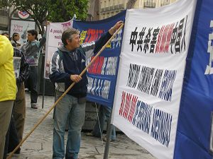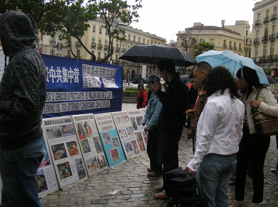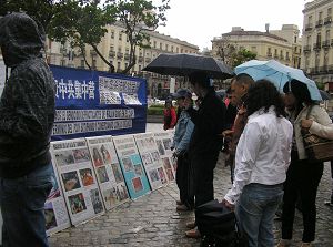 集会开始不久,本来就阴云密布的天空下起了雨,但那些善良的市民、学生和各国游客依然冒雨签字声援法轮功和中国民众退出中共。有一阵风很大,几次将图片板刮倒,但马上就有路人过来帮助扶起图片板;一位来自东欧国家的中年人热心的帮助加固横幅,他说:“我曾在共产党统治下生活了三十多年,我很了解共产党的邪恶,我支持你们,坚持!坚持!你们一定会胜利。”