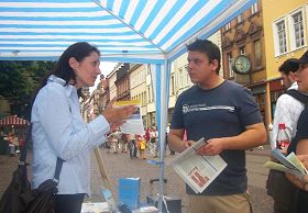 在退党摊位上,人们可以得到揭露中共邪恶本质的《九评共产党》一书、关于法轮功无辜被中共迫害的信息、还可以签名反对迫害,更有中国人利用这个机会签名退出中共党团队组织。