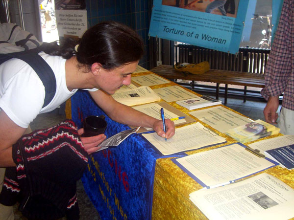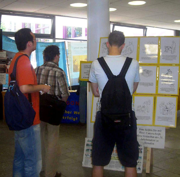 从六月三十日到七月四日,法轮功学员在德国西南部地区卡斯鲁尔大学的食堂前厅里,申请了为期一周的信息台,利用中午的时间向大学师生和员工介绍法轮功被中共迫害的真相,同时为“全球百万签名”活动进行征签。很多人前来了解有关信息,他们想知道什么是法轮功,中共为什么要迫害法轮功。法轮功学员向他们介绍了这个修炼功法一九九二年从中国传出,短短几年间令亿万人身心受益,然而以谎言和暴力维持统治的中共无法容忍广大民众对“真善忍”的信仰,于九九年开始了对法轮功修炼者的残酷迫害。九年来,这场迫害给中国民众带来了巨大的灾难。了解到真相,很多卡斯鲁尔大学的师生在征签簿上签名反迫害。