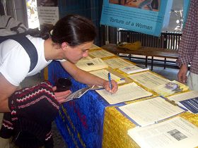 有一位学生,了解到中共活摘法轮功学员器官一事,在征签簿上签了名。之后他又和一位同学前来信息台,希望法轮功学员能再将中共活摘器官一事详细描述,因为这事情让人实在无法理解。当从法轮功学员那里了解到中共集权肆无忌惮的种种罪行之后,他们明白了真相,那位跟随来的同学也马上在“全球百万征签”表上签下了自己的名字。