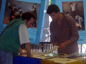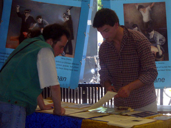 也有些路过的中国人来到信息台索取了关于中共迫害法轮功的资料,其中有两位中国学生长时间的逗留在展板前,观看那些揭示法轮功学员无辜受酷刑迫害的展板。当法轮功学员和他们交谈时,他们点头表示中共政权的这些行为是非人性的。