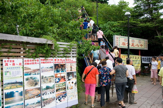 |  法轮功学员在台南赤嵌楼展出偌大的看板引起路人的注目 |