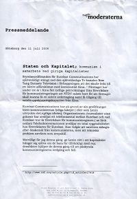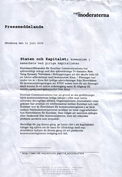 【明慧网二零零八年七月十三日】(明慧记者瑞典报导)二零零八年七月十一日,瑞典驻欧洲理事委员代表团团长,欧洲理事委员会(PACE)副主席林德布劳德先生(Goran Lindblad)向媒体发表新闻公报,要求欧卫公司恢复新唐人的播放信号。