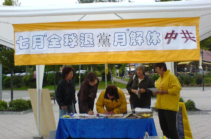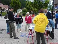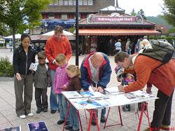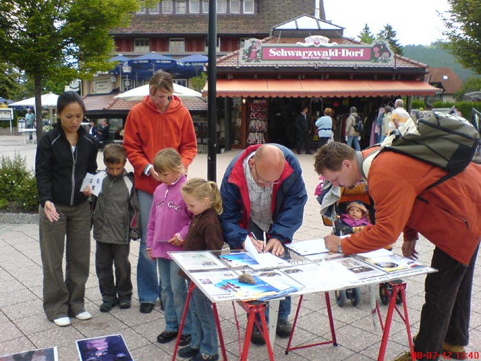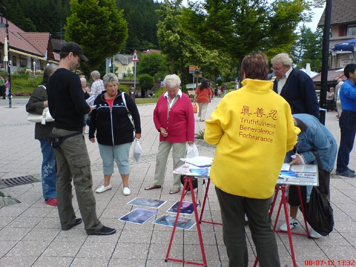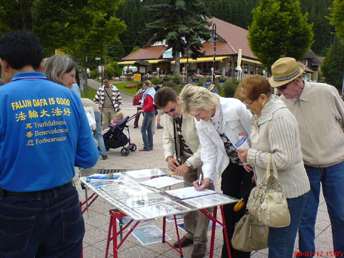 【明慧网二零零八年七月十四日】“法轮功受迫害真相联合调查团”(CIPFG)发起的“全球百万征签”活动,呼吁在北京奥运前彻底制止中共迫害法轮功。德国部份法轮功学员,在二零零八年七月十二日星期六,又来到黑森林景区著名的旅游景点缇缇湖(Titisee)举办信息日,揭露中共邪恶,征签反迫害。