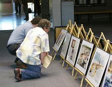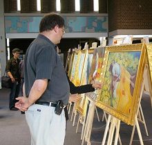 ![]() 艺术系主任肯•科绨斯(Ken Coates)在欣赏法轮功学员的作品。 |