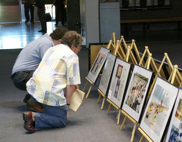 ![]() 社会及技术价值中心董事Norman Ball和同事一起观看活动现场介绍法轮功的图片展。 |