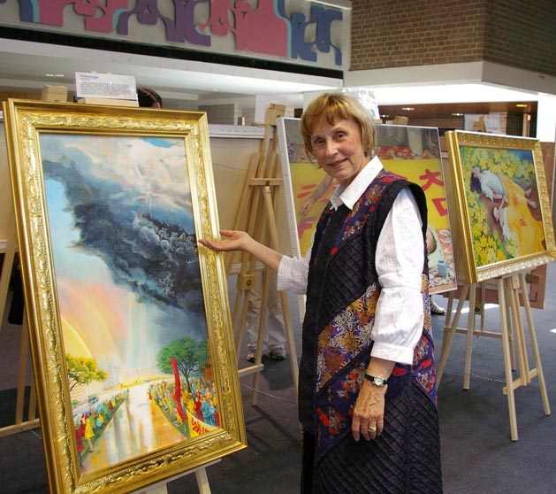 ![]() 画家吉利丝(Kathleen Gillis)在她的作品《The Heavens Speak》前。 |
