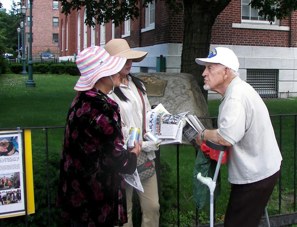 老人说:“共产党是邪恶的,我有过亲身的经历。我知道法轮功学员在此地是在帮助人们退出中国共产党,所以我要来支持法轮功学员。”