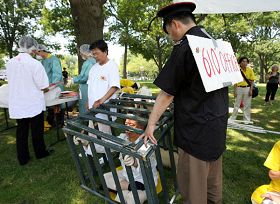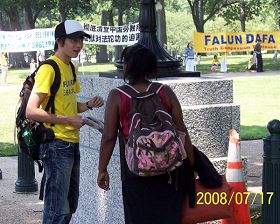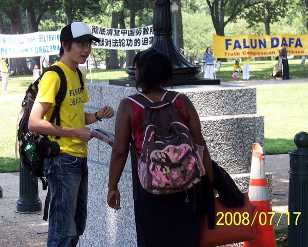 【明慧网二零零八年七月十八日】(明慧记者徐菁华盛顿采访报道)斯斯文文的许智超站在美国首都华盛顿宪法大道上,微笑着向过往的行人们发放法轮功的真相资料。他不时的或和驻足的游人聊聊,或和匆匆赶路的工作人员一起快走几步,甚至有时和锻炼的人一起跑几步,人们在接受传单的同时也听到了简短的介绍。渐渐的人们的脚步慢了下来,开始倾听,开始询问,甚至站出来接受媒体采访,表示声援法轮功的反迫害活动,因为更多的人被许智超身旁来自世界各地的法轮功学员和支持者们的大型集会活动所吸引。