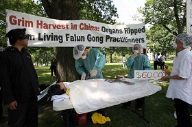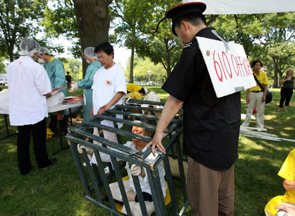 集会现场,揭露中共活摘法轮功学员器官的模拟演示