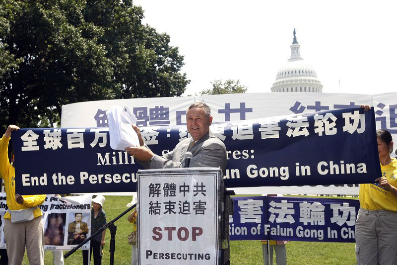 在国会山集会上,罗拉巴克议员非常郑重的从加拿大律师调查迫害法轮功委员会代表Clive Ansley手中接过,来自全世界一百二十八个国家的政要和民众,要求结束中共对法轮功修炼者迫害的百万人签名表。他高举着厚厚的签名表说:“与那些只为赚钱的几百或几千美国公司比,这才是真正的、人民的声音。”