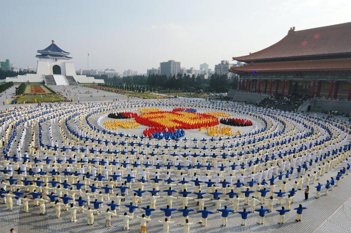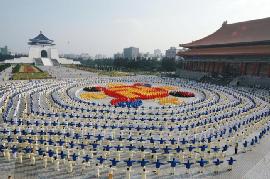 ![]() 二零零五年十二月二十五日,四千多名法轮功学员在台北市中正纪念堂广场前排组法轮图形 |