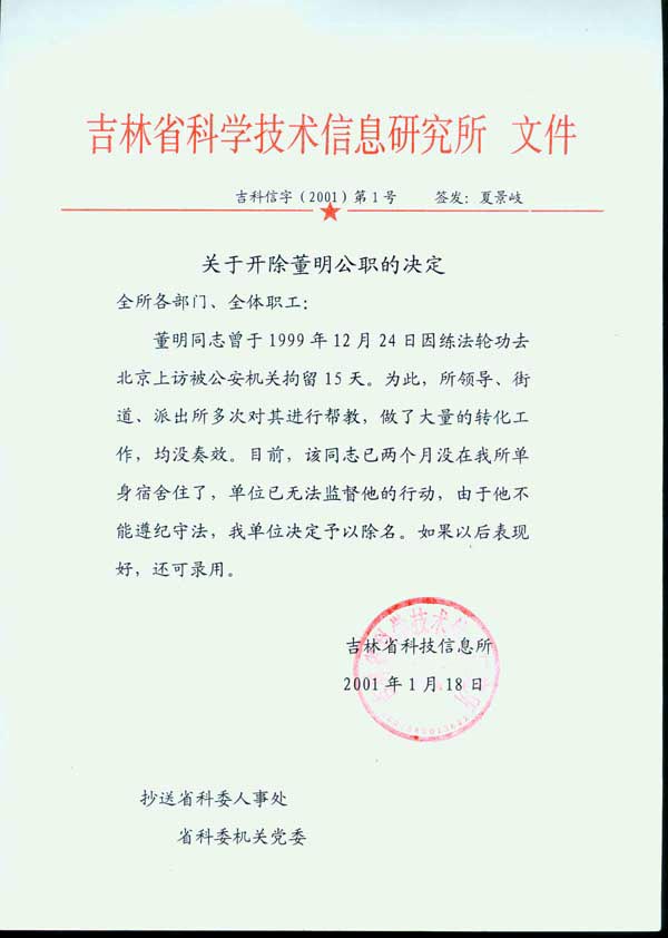 ![]() 吉林省科技信息研究所对法轮功学员董明的迫害(停薪留职协议书,开除公职通知 取消住房通知) |
