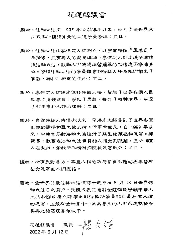 ![]() 二零零二年五月十二日,法轮大法洪传十周年前夕,台湾花莲县议会议长杨文值代表全体县民呼吁中共停止对法轮功学员的迫害,并预祝全世界千千万万善良的人们永远根植在真善忍的高境界领域中。 |