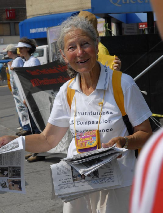 当天,法轮功学员在法拉盛,有的派发法轮功真相资料,展开“法轮大法好”等横幅,及展示中共酷刑迫害法轮功的真相图片。