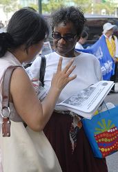 法轮功学员代表易蓉表示,今天是中共迫害法轮功第九年,这是一个沉痛的日子;近两个月来,中共还把黑手伸到海外来,在操控打手谩骂、殴打、攻击法轮功学员,刚开始的三个礼拜,它们的规模之大,在海外是首次,通过这段时间法轮功学员的讲真相,越来越多民众站出来支持法轮功学员。现在街上如果有人撕报纸、或骂法轮功学员,经常有正义的民众出来制止他们,并说:“这里不欢迎共产党。”还有的当地居民给学员送水、送花。