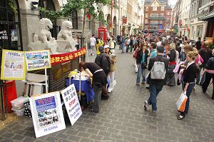 二零零八年七月十九日星期六,在中共迫害法轮功整整九年之际,英国法轮功学员走入伦敦唐人街,向世人展示大法美好,揭露中共邪党出于其邪恶本性迫害法轮功的真相,呼吁共同制止中共暴行。
