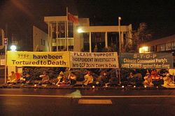 二零零八年七月二十日晚七时,新西兰法轮功学员在奥克兰市的中领馆前燃起点点烛光,悼念自中共镇压法轮功九年以来,被迫害致死的中国大陆同修。