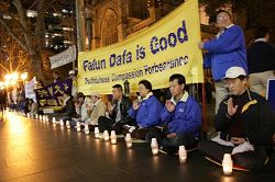 二零零八年七月二十日,夜幕降临之时,澳洲悉尼法轮功学员来到市政厅广场,默默的点起盏盏烛火,静静的坐在微风中,悼念为维护“真、善、忍”真理而遭中共迫害致死的同修,呼吁立即结束长达九年的残酷迫害。