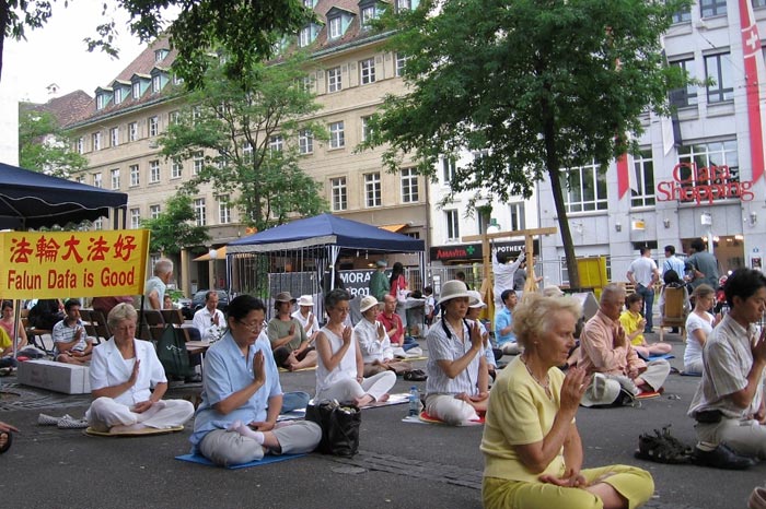 为了让那些孩子不用再担心自己父母的安危,为了制止九年来中共对法轮功学员的迫害,二零零八年七月十九日,法轮功学员在瑞士第三大城市巴塞尔(Basel)的Clara广场上展示功法,并演示法轮功学员在中国所受到的酷刑。