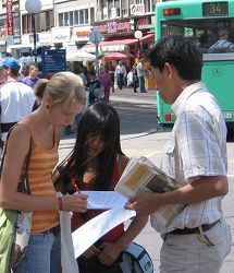 年轻的瑞士姑娘Sarah曾经为制止中共对法轮功的迫害签过名,她也常常听说法轮功,因为她认识一位法轮功学员:“我所了解到的是,法轮功决无坏处,法轮功修炼者只是想提高自己。我觉的(法轮功学员)因此而受到迫害,真是太可怕了。”