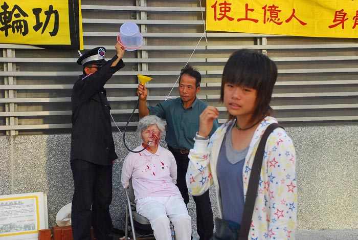 ![]() 高雄街头的法轮功受迫害酷刑展演──强迫灌食 |