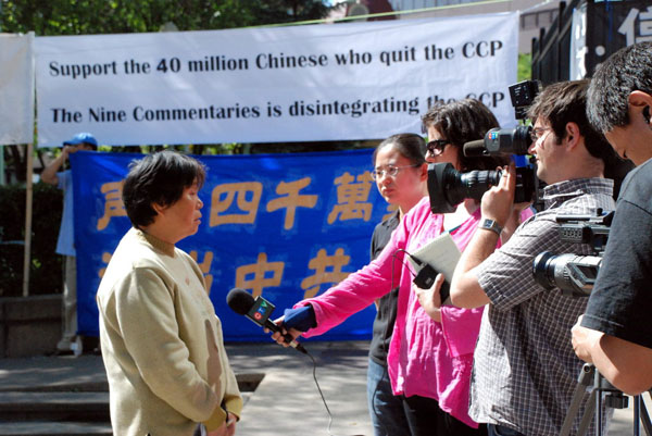 “前苏联异议人士Natan Sharansky,几年前写过一本书,叫做民主案例(The Case for Democracy)。在书中他提到,你是否有一个自由的社会,一个最基本的检验方法就是:你是否敢站在城市里的广场,把你心里的话说出来,而不用担心你是否会被拘捕,或骚扰,或被枪毙,或是坦克从你身上压过去。我们今天在这里讲的迫害的事,在天安门广场上是不允许谈的,在中国公开场合也不允许谈论,所以我们要在这里集会。”