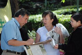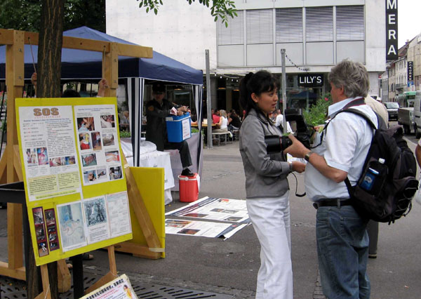 ![]() 民众观看展板了解法轮功受迫害真相 |
