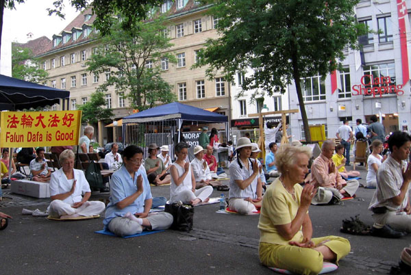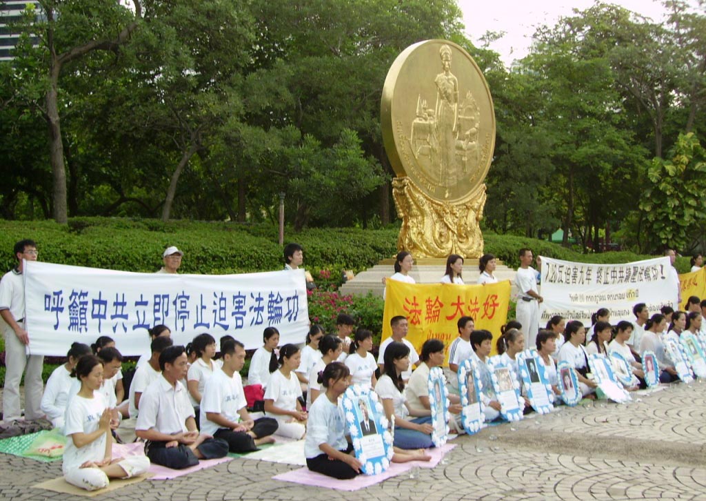 傍晚,大法弟子们在广场上静坐,表达对被中共迫害致死的同修的悼念。