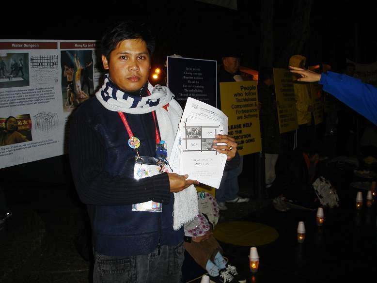 该学员代表还呼吁国际社会共同制止这场迫害:“我们在此悼念为维护真善忍原则被中共迫害致死的法轮大法弟子,他们的精神将激励我们去完成他们未完成的使命——继续和平理性地向世人讲真相,直到迫害停止、中共解体的那一天。同时我们呼吁国际社会共同协助制止这场浩劫,声援四千万中国人民退出中共恶党组织,立即结束长达九年的迫害。”