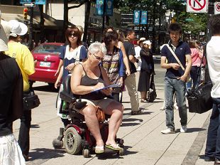 下午一点半,法轮功学员在烈日下沿着东京的繁华街道进行一个多小时的游行。在游行中,法轮功学员打出了“法轮大法好”、“真、善、忍”、“解体中共结束迫害”、“信仰自由是最基本的人权”、“天灭中共、天佑中华”等中日文横幅,由八十名法轮功学员组成的“天国乐团”在游行队伍的最前面,之后是身穿白色服装,手捧被迫害致死的法轮功学员遗像的女学员队伍,随后的队伍中展示了法轮功学员因为坚持自己的信仰而遭到中共酷刑、被迫害致死的图片,有数十名法轮功学员演示功法,展示法轮功的美好,最后是声援“三退”(退出中共党、团、队)的队伍。“天国乐团”隆隆的鼓声震撼人心,法轮功功法的优美祥和,残酷迫害事实的触目惊心,引起路人关注,人们纷纷驻足观看并拍照。在游行队伍经过的道路两边派发资料的学员,不断遇到有路人询问关于法轮功的情况,有的愤怒的谴责迫害,并主动为呼吁结束迫害签名。