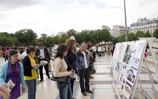 前来参加本次活动的有从法国各地赶来的学员,还有来自比利时和瑞士的大法弟子。大法弟子的功法表演,吸引了众多行人观看,人们不禁要问:如此祥和的功法为何在中国遭到禁止?学员们分发的真相资料和揭露中共罪行的展板让人们了解了迫害真相,法轮功学员心怀真善忍的理性反迫害与中共假恶斗的凶残本质形成鲜明对比。广场的另一头,活摘法轮功学员器官的模拟酷刑展,更令行人对中共的残忍暴行震惊,无不感到愤慨。了解真相的人们纷纷伸出援手,签名声援制止迫害。