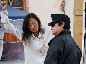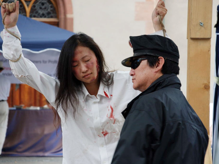![]() 模拟演示:中共非法关押法轮功学员,并施以酷刑,妄图让法轮功学员放弃自己的信仰 |