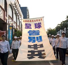 台湾法轮大法学会南区发言人郑其美先生在悼念会中表示,目前在《大纪元》网站上公开声明退出中共邪恶组织的人数已经超过四千万,并且仍在加速增长中;这起因于九年前的七月二十日,以江泽民、罗干为首的中共流氓集团开始对法轮功残酷迫害,经法轮功学员不断向世人讲清真相后,已使世人了解中共邪恶本质,也因此激发了汹涌的退党潮。
