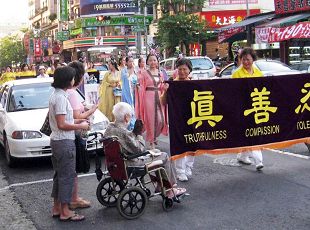 一位孝顺的媳妇推着行走不便的婆婆在旁观看游行。老婆婆今年九十岁了,从头到尾一直双手合十的向游行队伍致意,直说“不简单,不简单,很壮观”,看到了天国乐团、唐鼓队及其他表演,心情很愉快、很高兴!