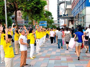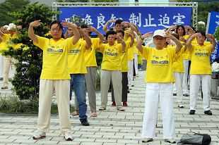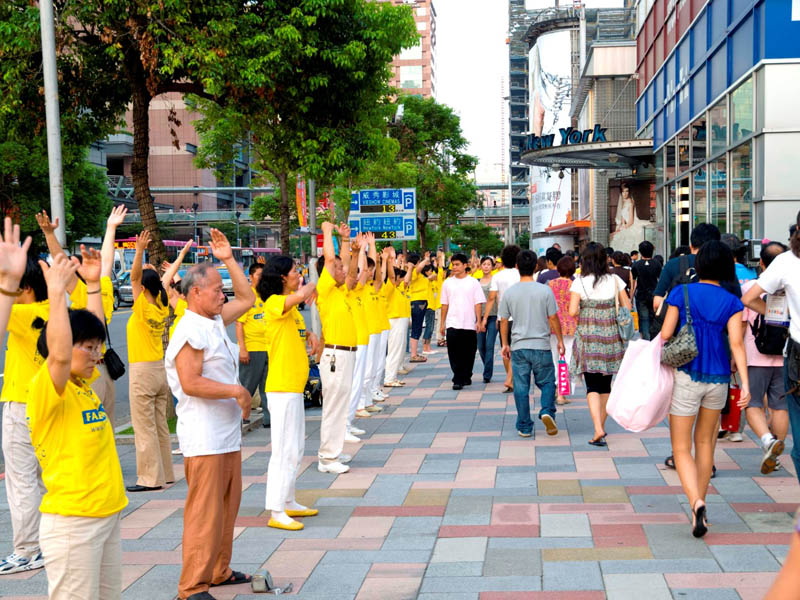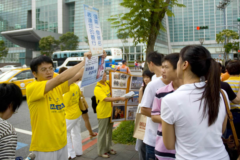 【明慧网二零零八年七月二十四日】(明慧记者周容台湾台北报导)二零零八年七月二十日,盛夏的台北午后,超过摄氏三十五度的高温,让人挥汗如雨,身着黄上衣的法轮功学员,三三俩俩,正忙着在台北地标“一零一大楼”附近的广场布置场地。