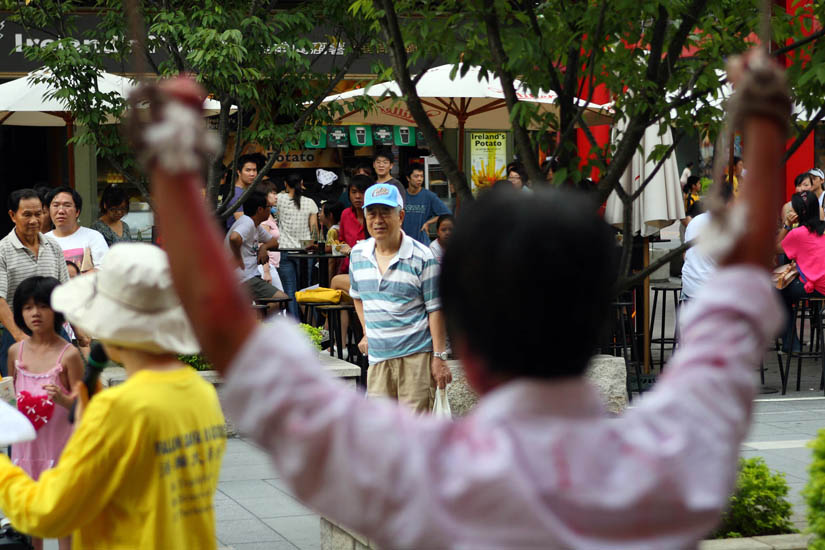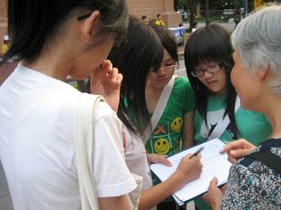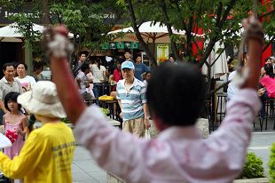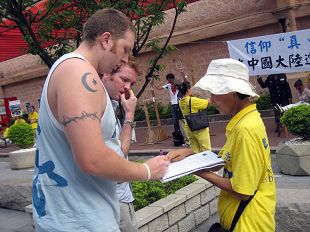 长期以来,笑容可掬的法轮功学员靠着一张嘴,几张传单,面对面的与民众接触,让许多人明白了真相。七月二十日的下午,许多法轮功学员顶着烈日,在活动的广场附近对路人讲清真相,征集联署签名共同制止迫害。