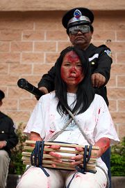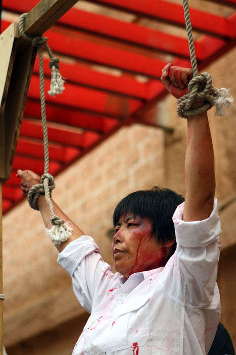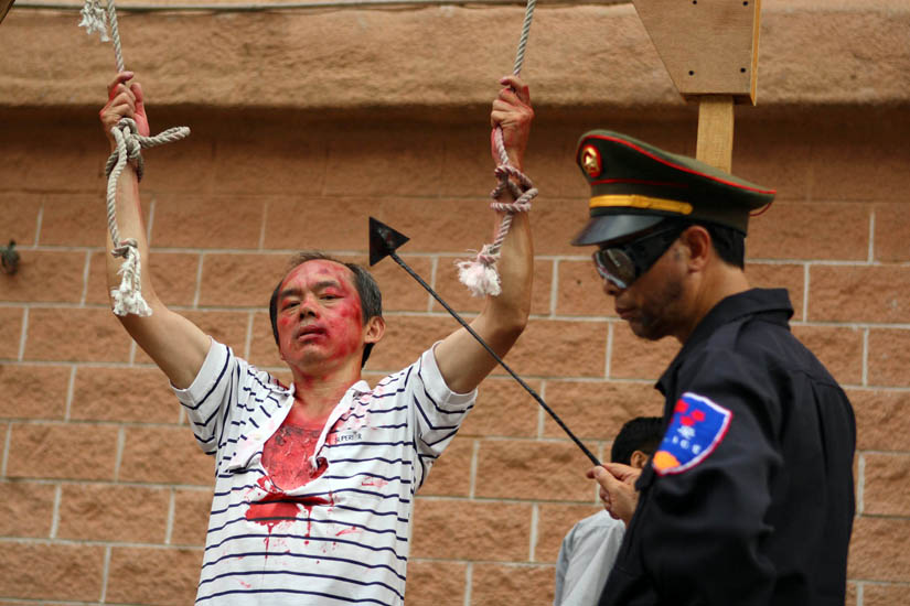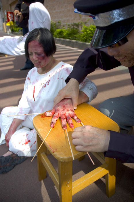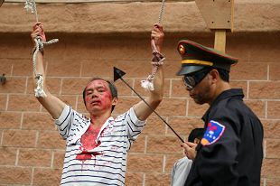 以真人模拟演示酷刑的方式,让民众知道中共政权对法轮功的迫害