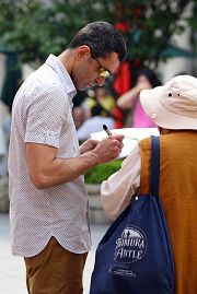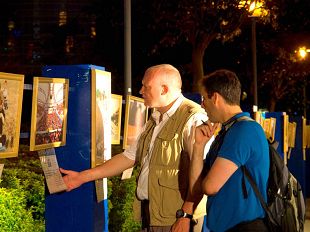 骑脚踏车路过的史学教授周健,非常仔细的读着每张迫害照片的说明,他说每个时代每个地区都有迫害善良的事件,但是他很佩服法轮功学员持续不懈的站出来揭露邪恶的勇气,他频问这个摄影展的展期,并期许法轮功学员继续加油。