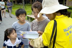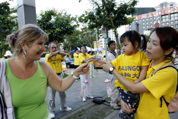 陈姓学员手抱女儿,开心的在分送一朵朵学员制作的“法轮大法好”莲花书签给路过的民众,她表示还有很多世人不明白真相,要更加紧步伐让更多的世人了解。她从事媒体工作,平日也透过媒体的形式去讲真相。