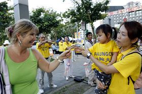 一位江浙口音的长者向记者表示:“我首先声明我不是法轮功,但是我非常欣赏法轮功的精神。你看他们头顶烈日,伫立街头,这样大的一个人群,这样多的人一起走上街头,还有很多白发老人和孩童。我一边看一边在想,到底是什么力量,把这些人凝聚在一起?如果是信仰的力量,就能让这样多人走上街头,为大陆受迫害的法轮功呐喊、伸张正义,为大陆法轮功鸣不平,捍卫真善忍的精神理念,那么我觉得这些人太伟大、太了不起了。让人钦佩!”