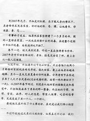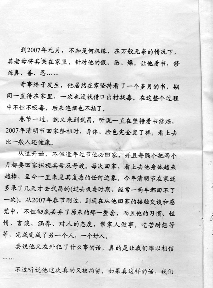 到2007年元月,不知是何机缘,在万般无奈的情况下,其老母将其关在家里,针对他的假、恶、燥,让他看书,修炼真、善、忍……。